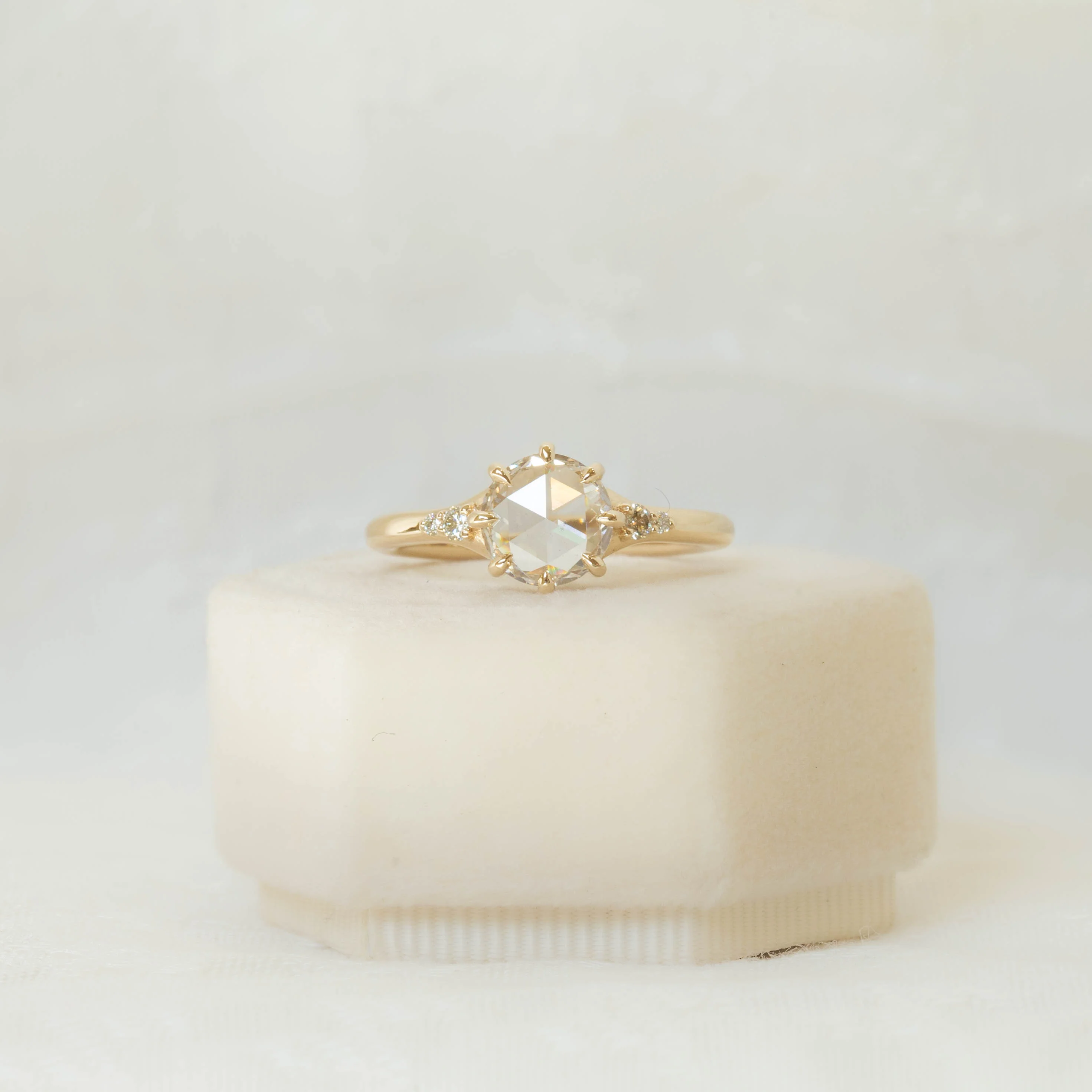 Elegantly designed to highlight its centerpiece, this stunning ring features a 1.76ct rose-cut clear lab-grown diamond as its focal point. Flanked by two accent stones on either side, the tapered design enhances the ringās silhouette, drawing attention to the brilliance and clarity of the central diamond. This timeless yet modern piece is perfect for those who value sustainable luxury and sophisticated style, making it a meaningful addition to any jewelry collection.