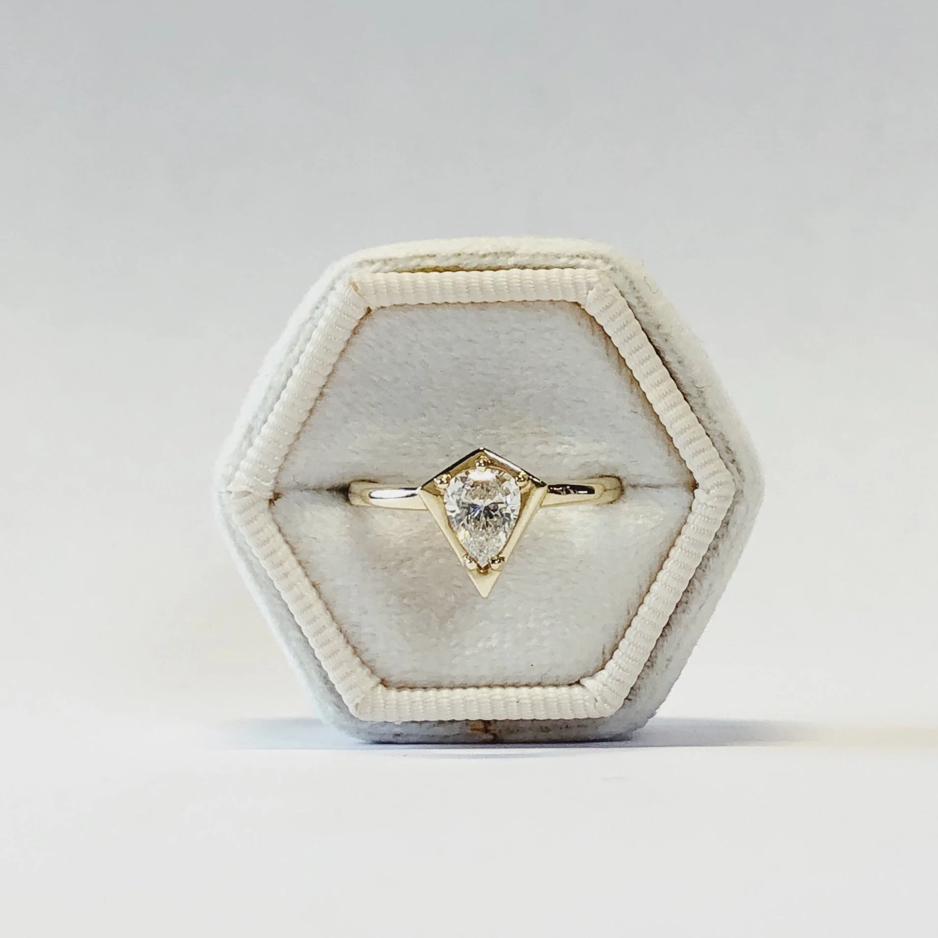 Take a look at this uniquely set and beautifully cut 0.62ct SI1 J pear-shaped diamond set in a custom made kite-shaped ring.