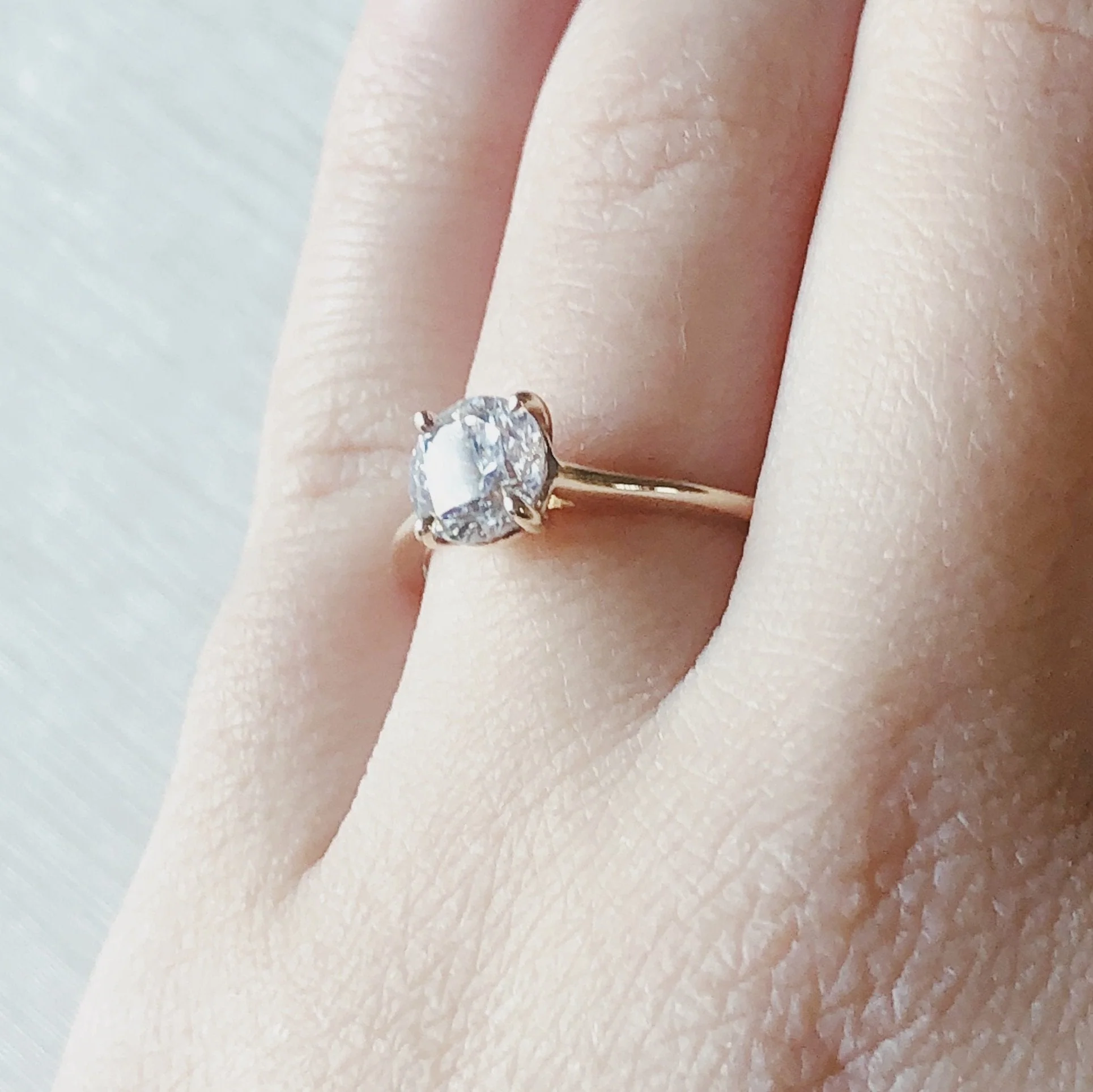 When looking at cathedral rings, one might say "They all look alike." However, our soon-to-brides would beg to differ. They put in their thoughts and critiques to our designers and the petite custom cathedral was born. This ring is available in rose, white and yellow gold. Currently it houses a cubic zirconia as a space holder. Our team of gemologists and experts would be happy to show you our large earth-mined & lab-grown diamond inventory and help you choose the perfect center stone for this stunning ring.